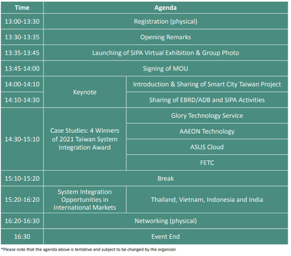 WSIC 2021, also the 3rd WSIC, will be a hybrid (both off-line and on-line) event which collaborates with Smart City Summit and Expo (SCSE) and focuses on the topic “AIoT Invigorates Smart City”. WSIC 2021 will feature sessions on SIPA activities regarding smart city development with regional multilateral development banks including Asian Development Bank (ADB) and European Bank for Reconstruction and Development (EBRD). In addition, the 4 winners of 2021 Taiwan System Integration Award will further demonstrate that Taiwan has extensive experience and a solid foundation in system integration and international cooperation. And lastly, distinguished speakers from Thailand, Vietnam, Indonesia and India, will also provide first-hand information on smart city needs and entry strategies for their respective markets.